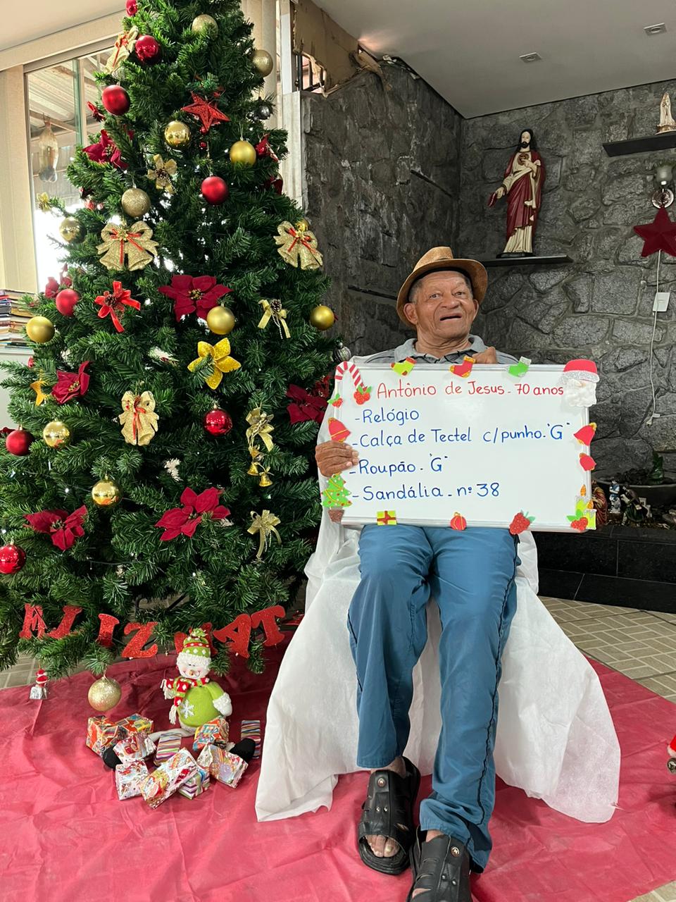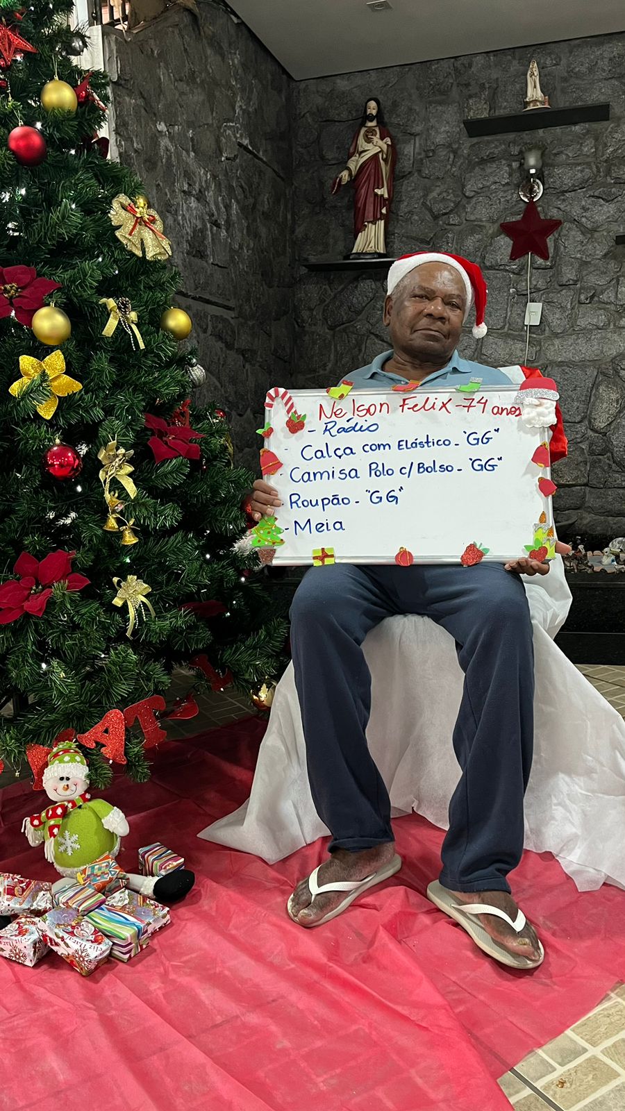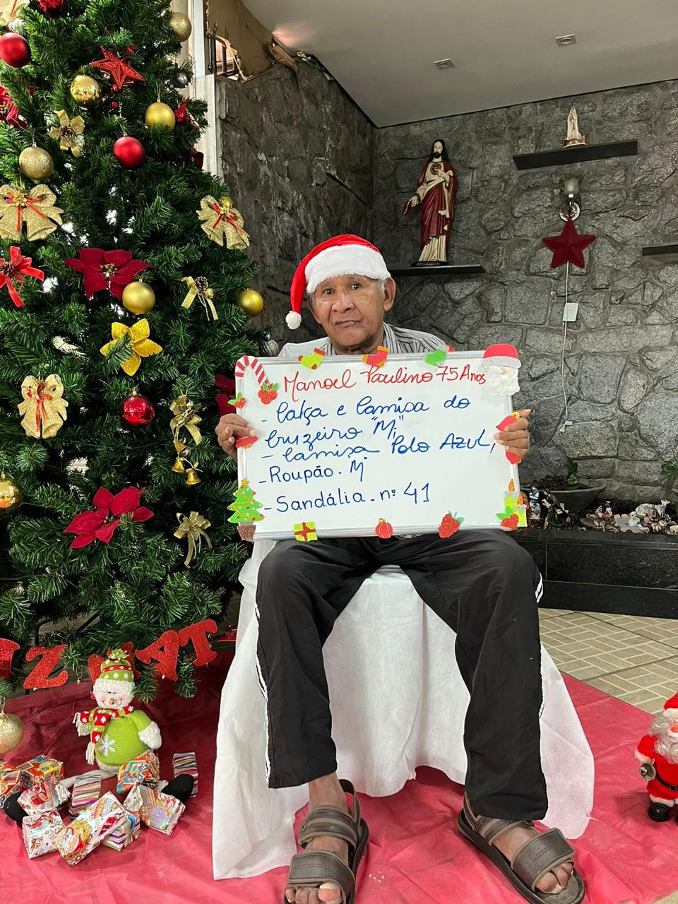 - Manoel – 75 anos – Calça, camisa do Cruzeiro M, Roupão, sandália 41 (adotada)
