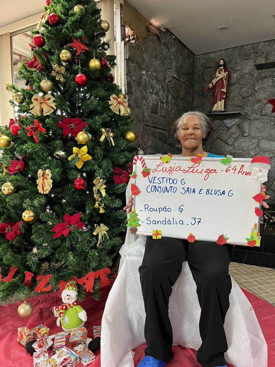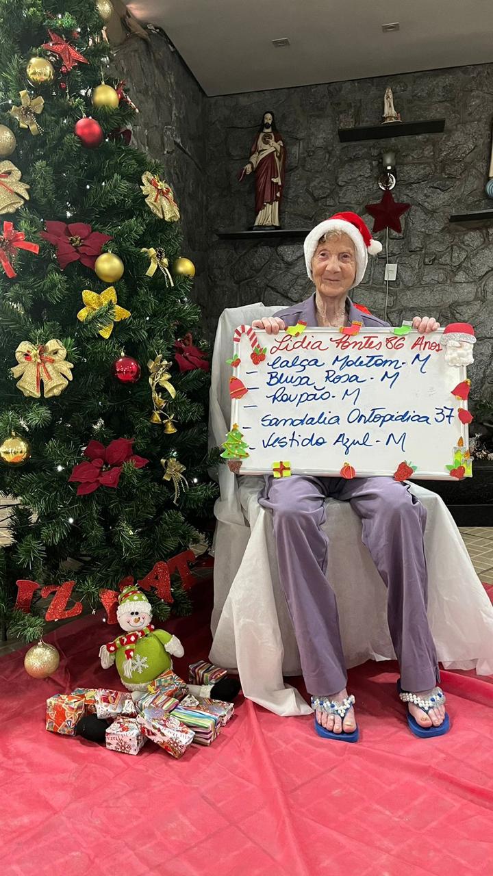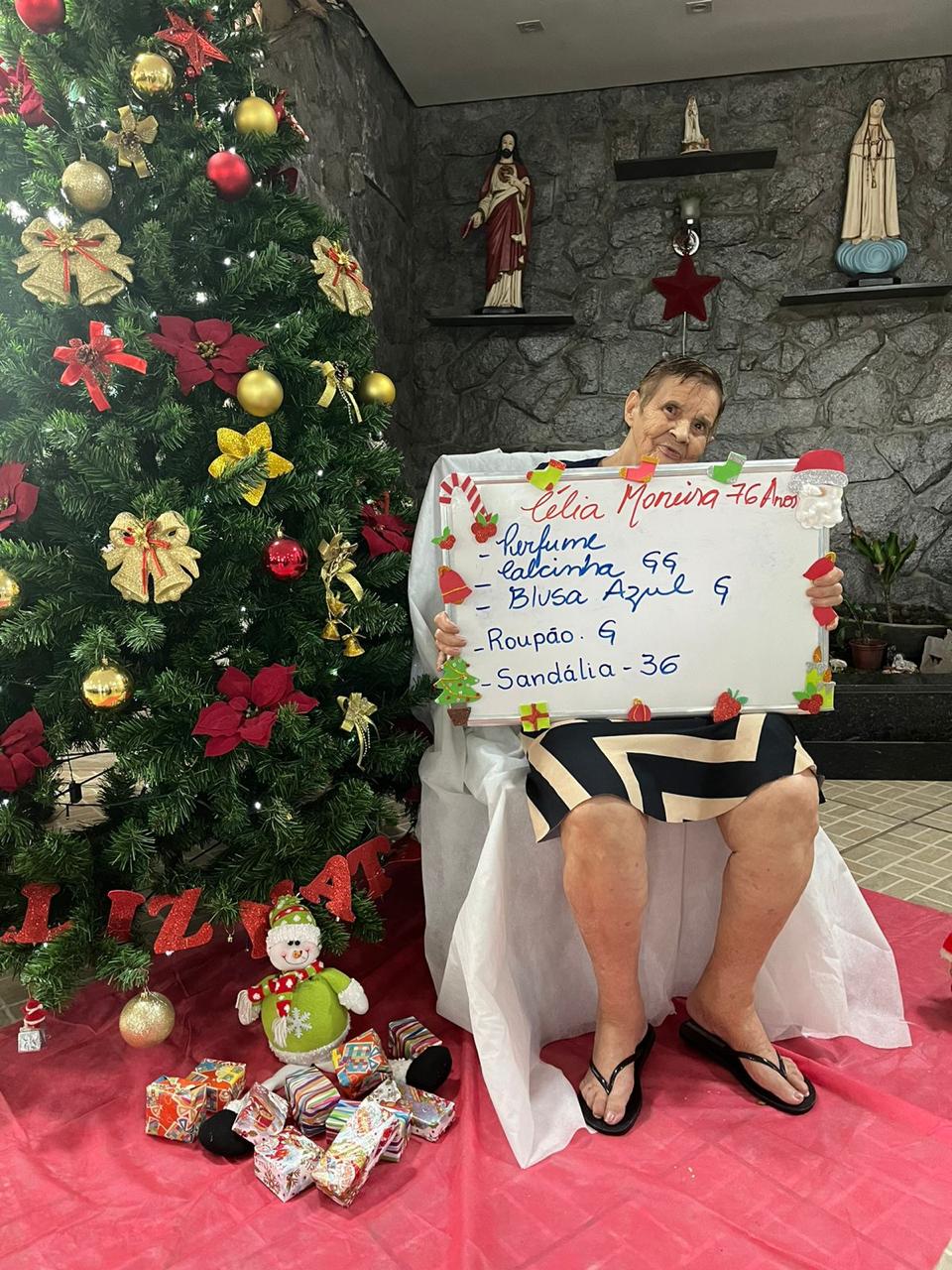 - Mariana Flores – 85 anos – Perfume, conjunto GG, Chinelo 35, roupão, calcinha G (adotada)