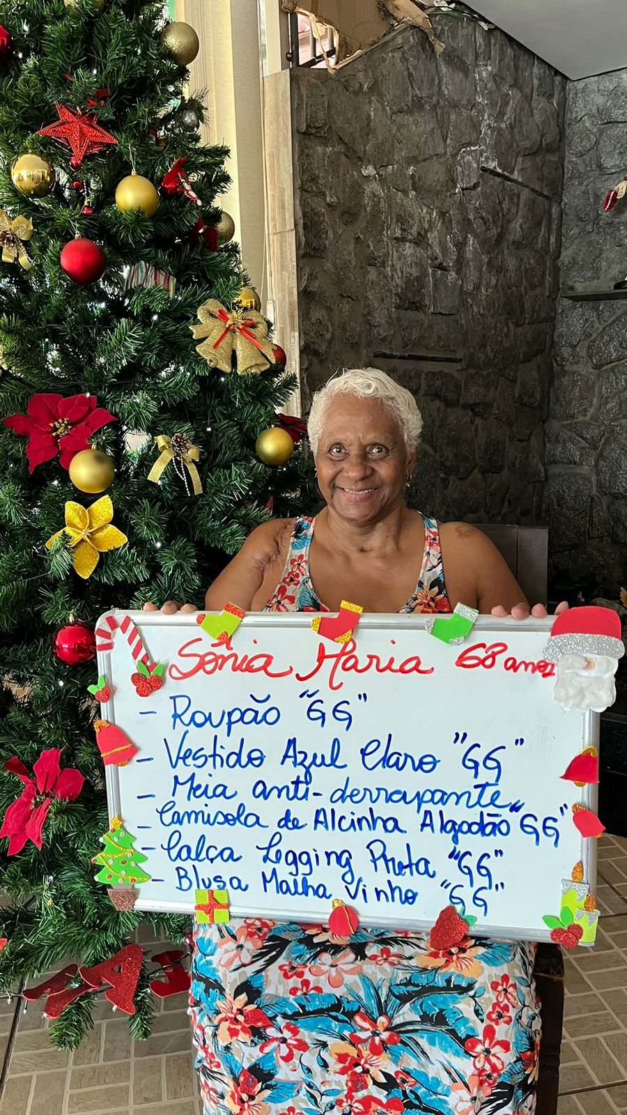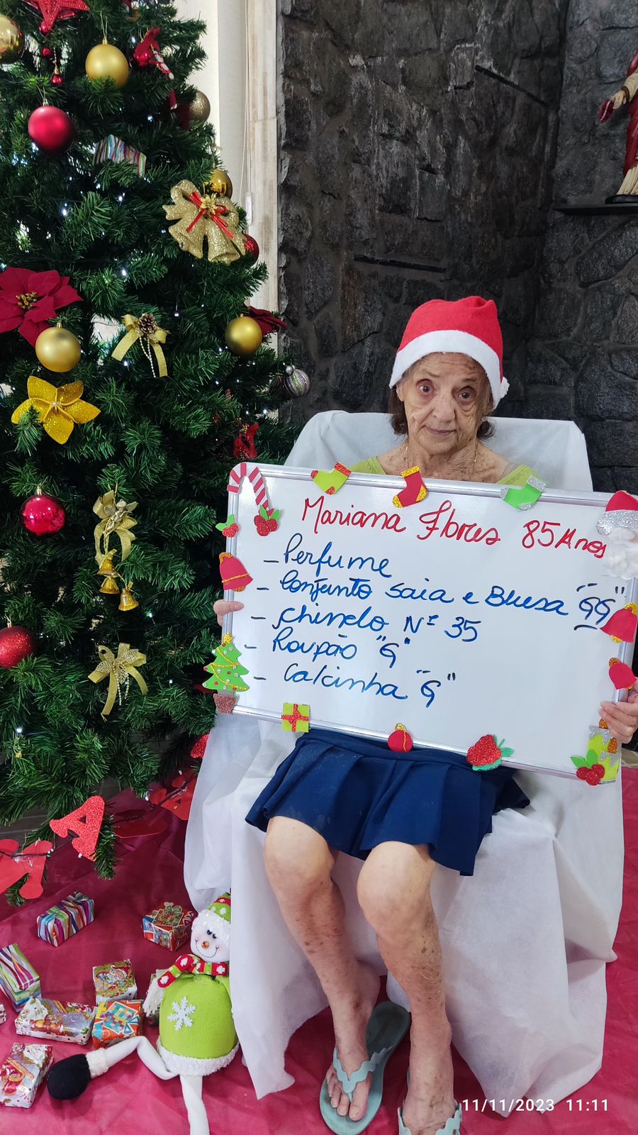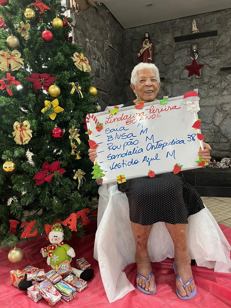 - Mariana Flores – 85 anos – Perfume, conjunto GG, Chinelo 35, roupão, calcinha G (adotada)