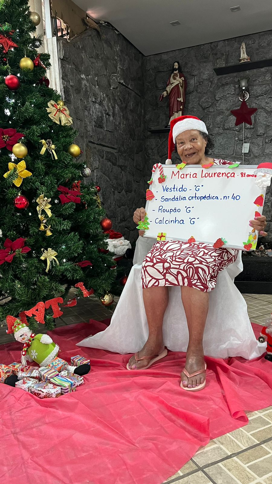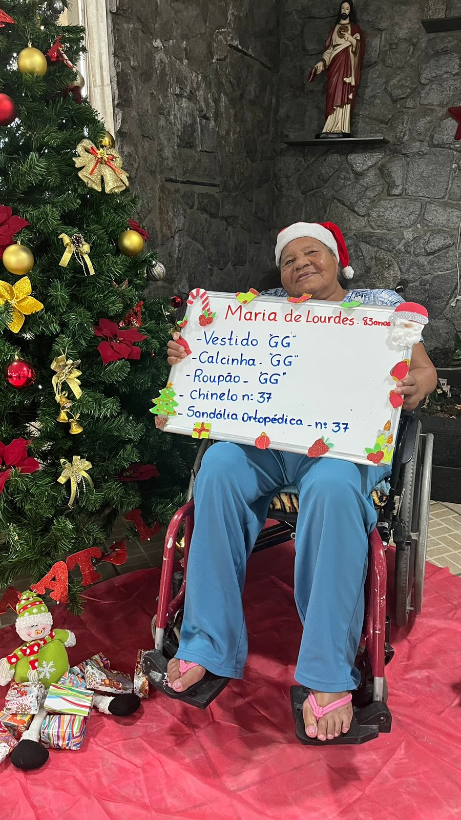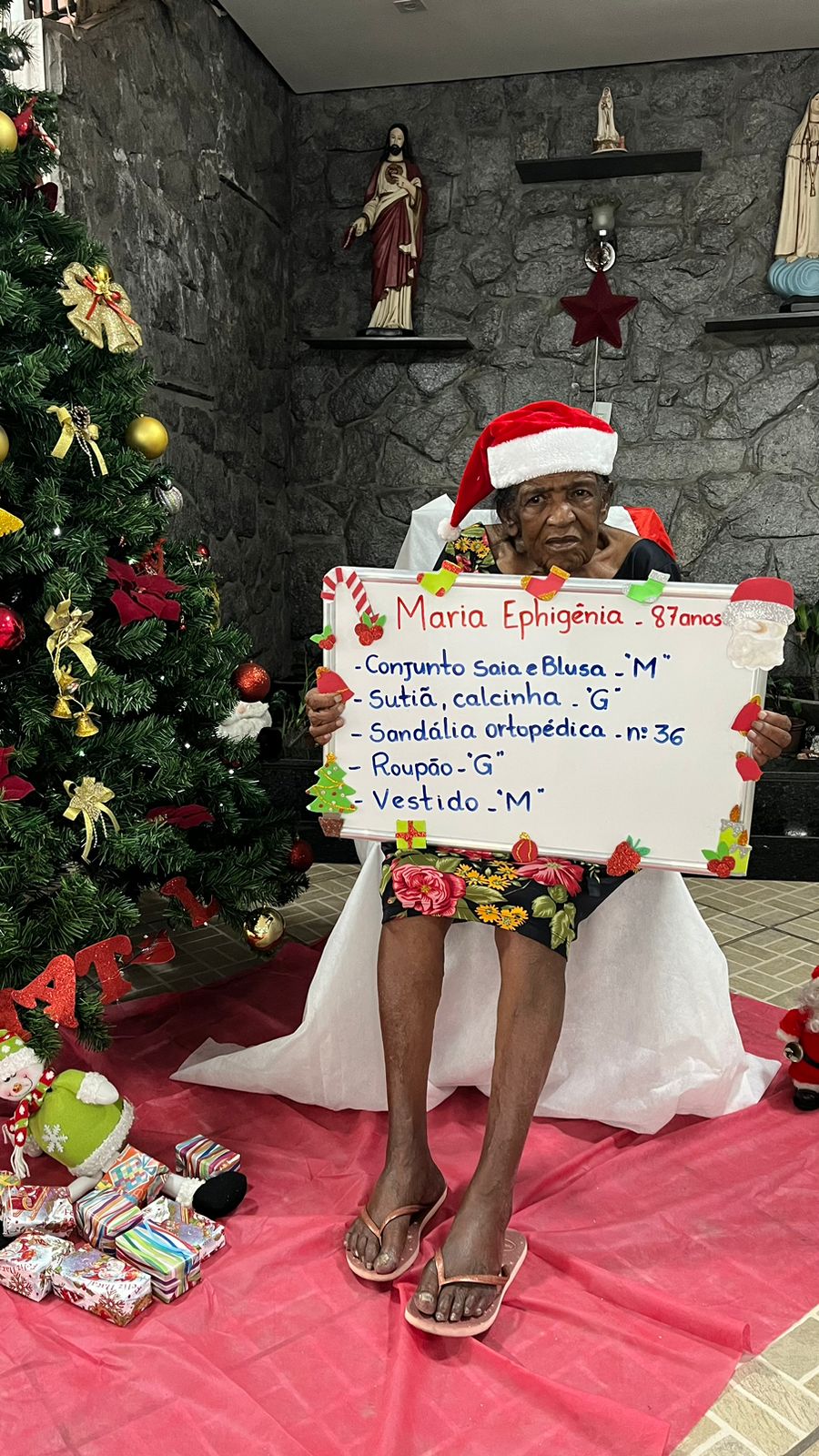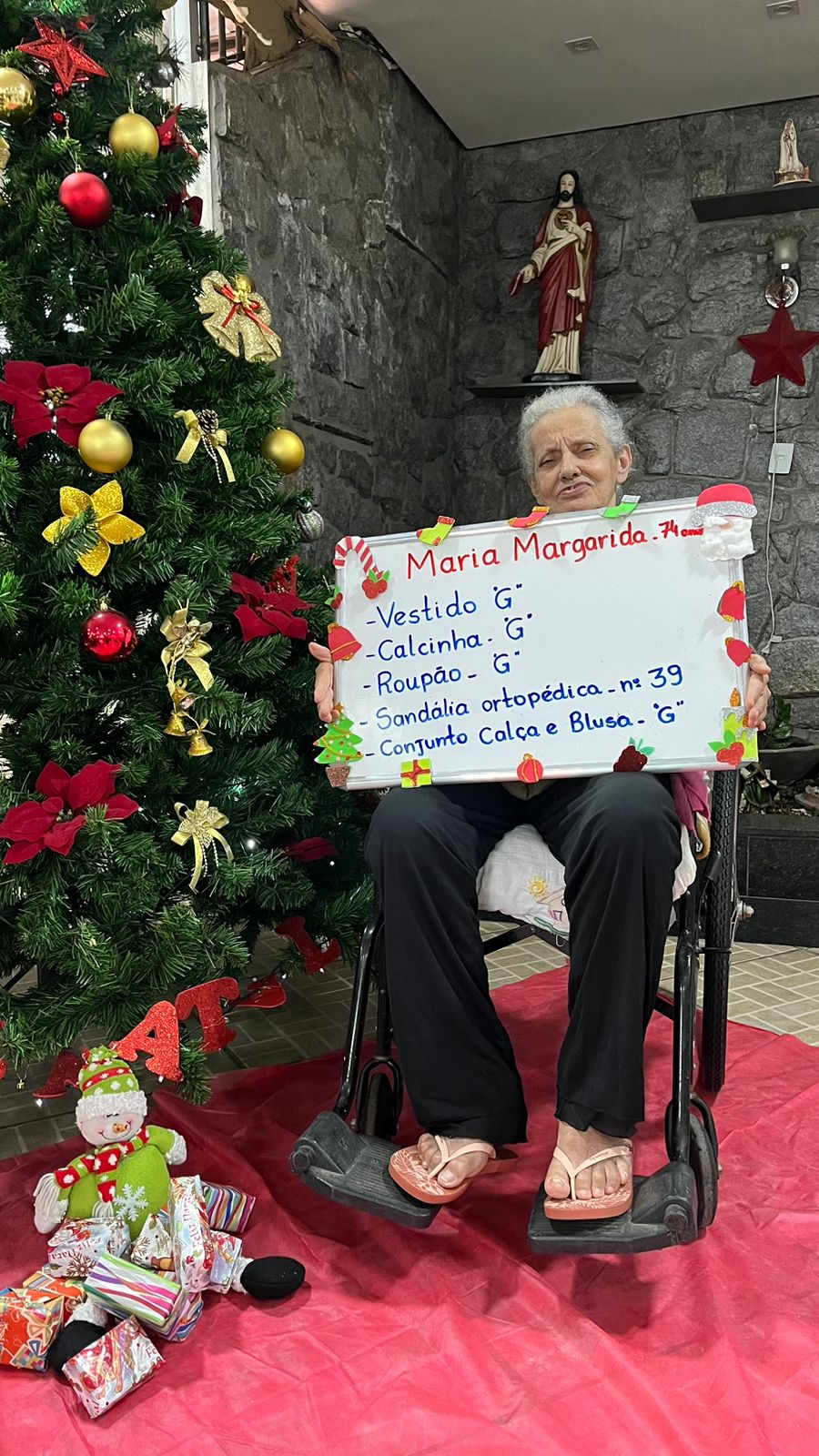 - Maria Margarida – 74 anos – Vestido G, calcinha G, roupão G, sandália ortopédica 39 (adotada)