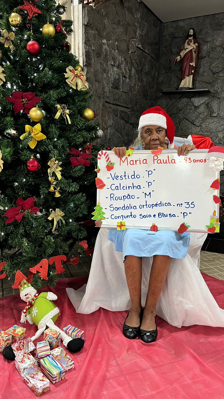 - Maria Paula – 83 anos – Vestido P, calcinha P, roupão, sandália ortopédica 35 (adotada)