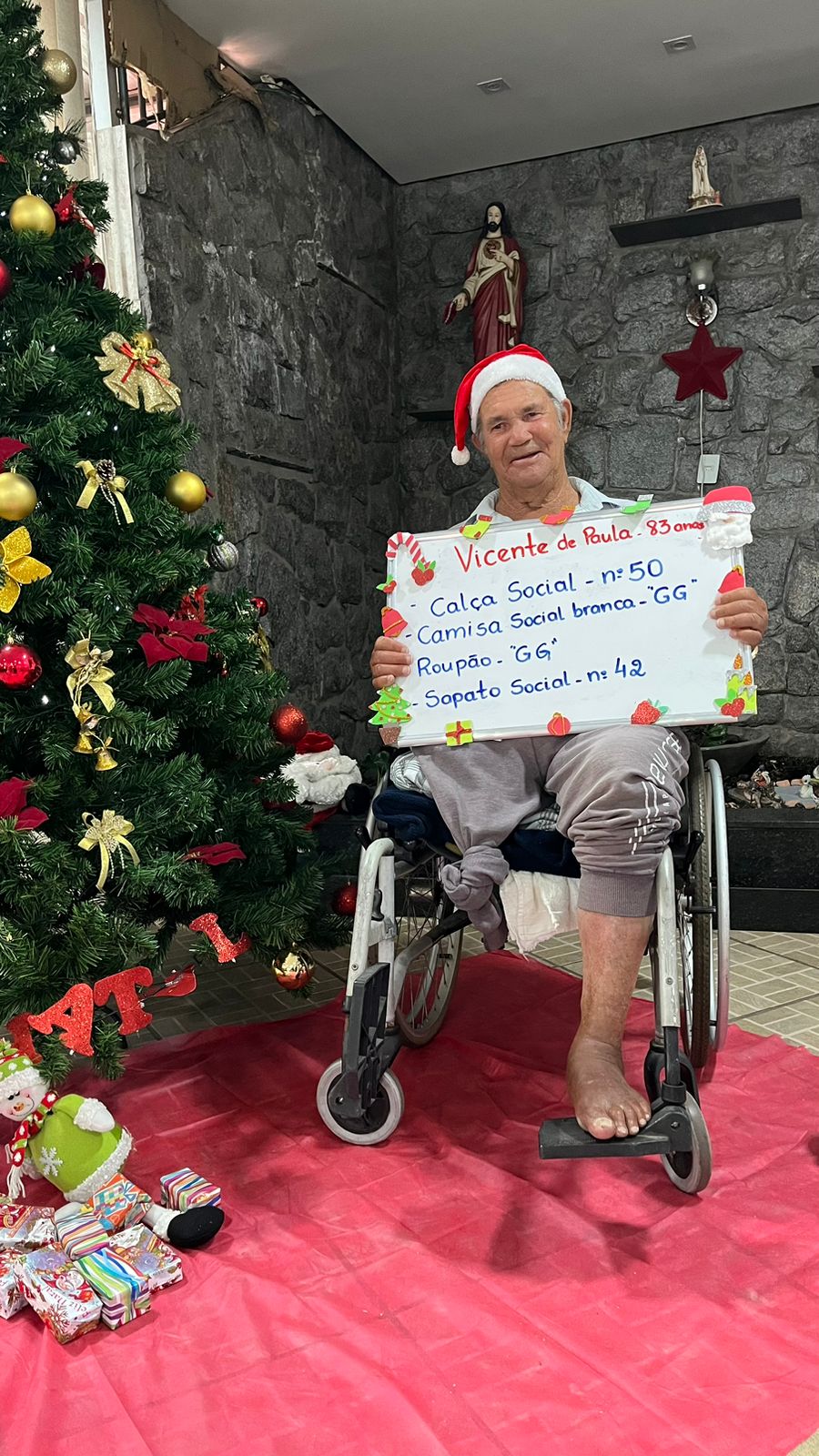 - Vicente de Paula – 83 anos – Calça social 50, camisa social GG, roupão GG, sapato 42 (adotada)